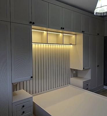 - İnteqrə LED işıqlandırma: dolab içlərində və başlıq zonasının üstündə zolaq işıqlar