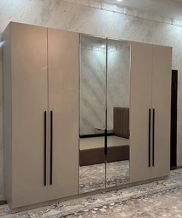 - 5 qapılı paltar şkafı: mərkəzdə 2 ədəd tam boy güzgülü qapı, yanlarda mat açıq bej qapılar, uzun qara tutacaqlar. Daxili hissə asılqan bölməsi və rəflər üçün nəzərdə tutulub.