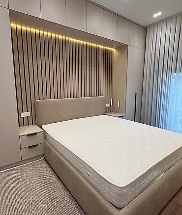 Müasir yataq otağı dəsti - Dizayn: Minimalist və modern üslub, boz rəng palitrası. Yumşaq, həcimli konturlu başlıq və çərçivə. - Çarpayı: Aşağı profilli, döşəksiz karkas; davamlı taxta lamellər üz...