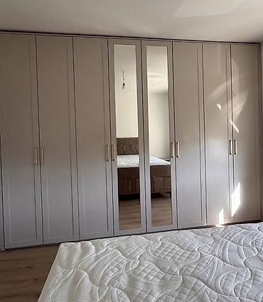 Mebel: Divar tipli geniş paltar dolabı Təsvir: - Müasir dizaynlı, 5 qapılı iri dolab - Ön panellərdə dekorativ relyef xətlər və qızılı rəngli uzun tutacaqlar - Neytral bej-boz ton, interyerə asan ...