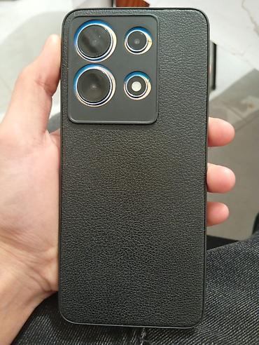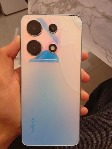 Şəkillərdə göstərilən məhsul satılır: Infinix smartfonu, arxa tərəfi iri üçlü kamera modullu, geniş ekranlı və qoruyucu keys ilə.