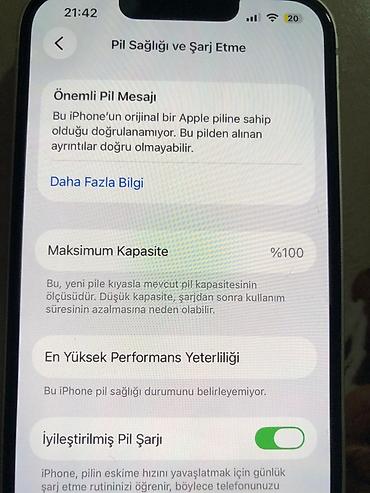 - Batareya bölməsi (ekran görüntüsünə əsasən): Maksimum tutum 100%; “Bu iPhone’un orijinal bir Apple pilinə sahib olduğu doğrulanıyor” mesajı göstərilir; “İyileştirilmiş Pil Şarjı” funksiyası aktivdir