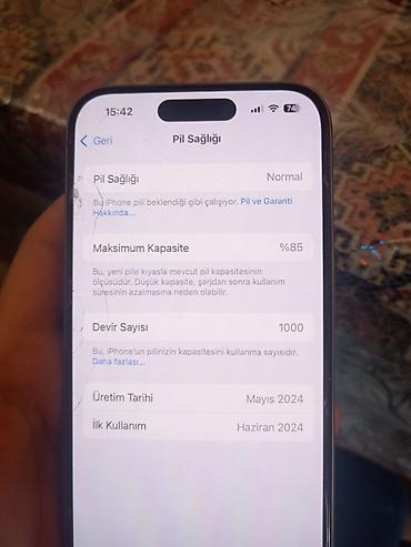 - Batareya bölməsi (ekrandakı məlumatlara əsasən): Pil Sağlığı – Normal; Maksimum tutum – 85%; Dövr sayı – 1000; Üretim tarixi – Mayıs 2024; İlk kullanım – Haziran 2024.
