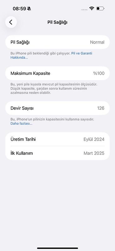 - Batareya: Maksimum tutum 100%, dövr sayı 126; istehsal tarixi – Sentyabr 2024, ilk istifadə – Mart 2025 (şəkillərdəki məlumat)