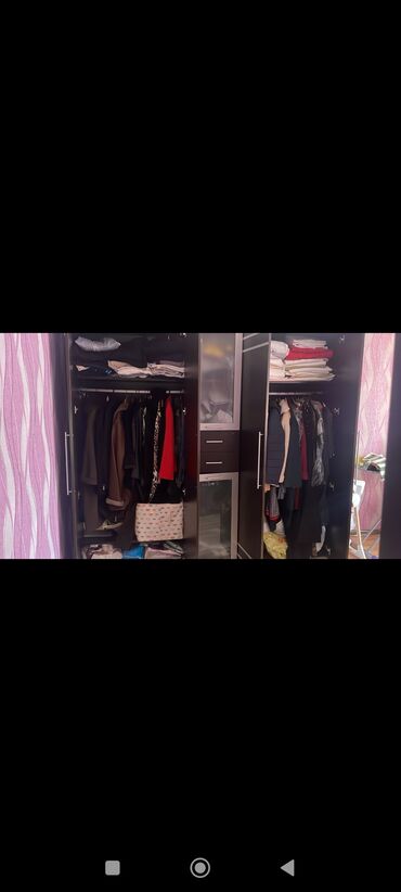 Tünd qəhvəyi rəngdə, müasir dizaynlı qarderob. Qarderobun mərkəzi hissəsində şüşə qapılı rəflər və iki siyirmə mövcuddur. Hər iki tərəfində isə paltar asmaq üçün geniş bölmələr yerləşir. Bu qarderob geniş saxlama sahəsi təmin edir və müxtəlif otaq interyerlərinə uyğun gəlir.