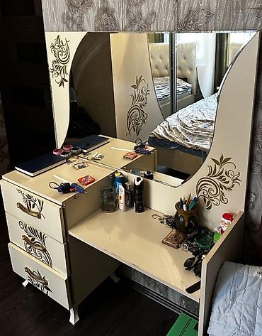 Mebel: Geniş güzgülü makiyaj/komod masası - Material: Tünd ağac rəngli korpus, ağ rəngli geniş üst panel - Böyük mərkəzi güzgü – tamboy, rahat baxış bucağı - Hər iki tərəfdə açıq rəf sistemləri: 6...