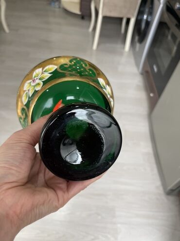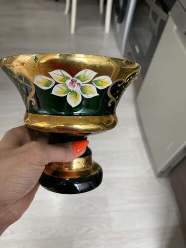 Bu dəst iki ədəd yaşıl rəngli, qızılı və ağ çiçək naxışları ilə bəzədilmiş şüşə qabdan ibarətdir. Qabların hər ikisi ayaqlıdır və yuxarı hissəsində geniş ağzı var. Böyük qab şirniyyat və ya meyvə q...
