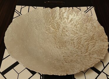 Baku electronicsdan alinib. Teze qutuda. Qızılı bəzəkli şüşə meyvəqabı/servis vazası - Material: qalın, şəffaf şüşə kasa + metalik qızılı tonlarda dekorativ ayaqlıq - Forma: enli, alçaq qab; dalğal...