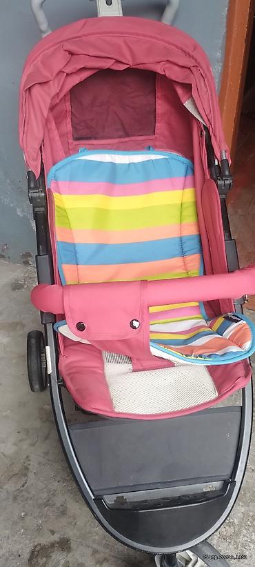 Uşaq arabası – Geoby/Geobey brendi (loqo üzərində “Geobey” yazılı). Rəng: bənövşəyi-çəhrayı geometric naxışlı. Əsas xüsusiyyətlər: - Geniş, çoxbölməli böyük qoşqalı qalın tənzifli günlük/kapot – t...