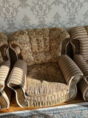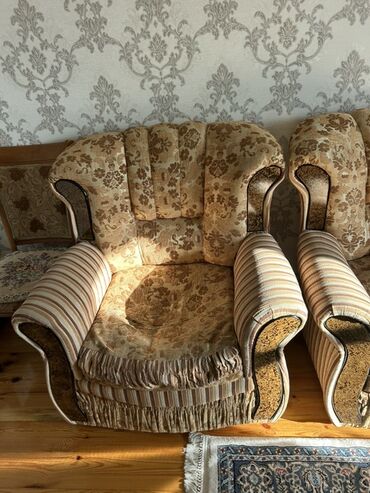 Klassik üslubda yumşaq mebel dəsti - 3 nəfərlik divan və 2 ədəd kreslordan ibarətdir. - Üzlük: çiçək naxışlı toxuma parça, bej və qızılı tonlar; yanlarda dekorativ tünd taxta elementlər. - Oturaca...