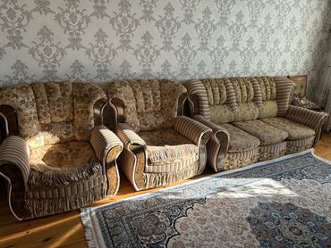 Divan və kreslolar yaxşı vəziyyətdədir 3 hissəli yumşaq mebel dəsti Tərkibi: - 3 nəfərlik divan - 2 ədəd geniş kreslo Dizayn və material: - İsti qəhvəyi və krem rənglərinin kombinasiyası - Yumşaq...