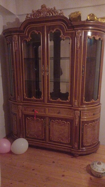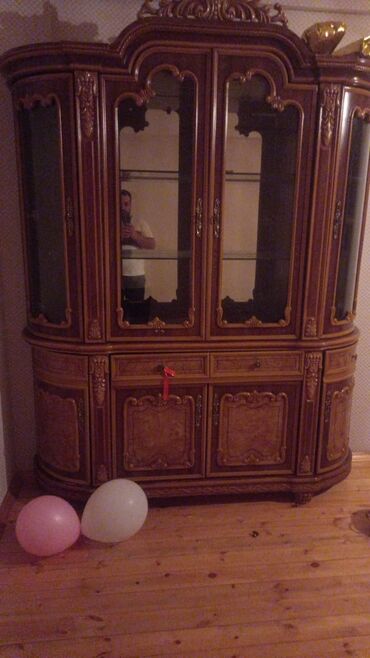 - Üst hissə: ortada 2 şüşə qapı və yanlarda şüşəli bölmələr; içəridə şüşə rəflər – qab-qacaq, kolleksiya və dekor üçün uyğundur.