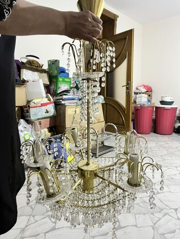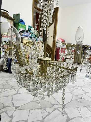 Kristal çilçıraq - Klassik üslubda, tavana montaj üçün əsaslı metal gövdə (qızılı ton). - Şam formasında bir neçə lampa başlığı ilə çoxşaxəli işıqlandırma. - Bolluca asma kristal/prizma bəzəkləri:...