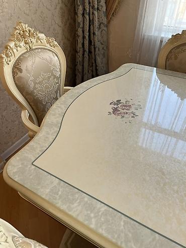- Yemək masasının geniş üst səthi, yumşaq bucaqlar, naxış detalları və üstündə şəffaf şüşə qoruyucu
