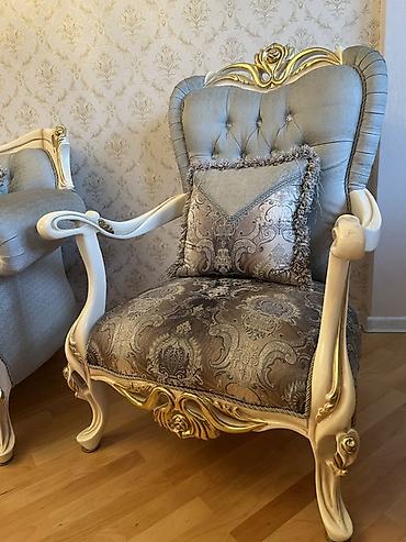 - Neoklassik/barokko tərzində oyma dekorlar, krem rəngli ağac karkas və qızılı detallar