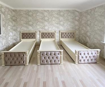 - Yataq çarpayıları: 3 ədəd tək nəfərlik çərçivə. Krem tonunda korpus, başlıq və ayaq hissəsində yumşaq, düyməli (kapitone) parça işləməsi, sütunvari künc elementləri və dekorativ oyma detallar. Eyni üslubda vahid kompozisiya yaradır.