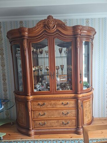 Klassik üslubda böyük vitrin-bufet - Material: Ağac konstruksiya, oyma dekor elementləri və listvenitsa/ceviz tonlarında cilalı örtük - Ön hissə: 4 şüşə qapılı vitrin bölməsi; şüşə rəflər və güzgü...