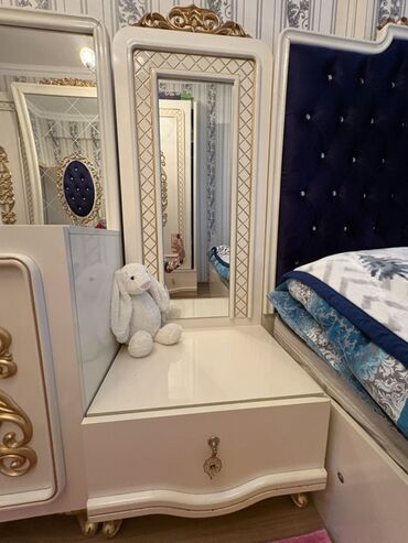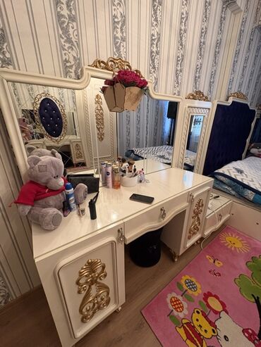 - Tualet masası: geniş iş səthi, yanlarda qapılı bölmələr və çekmecələr, üstündə üç hissəli güzgü kompozisiyası, qızılı dekor elementləri.