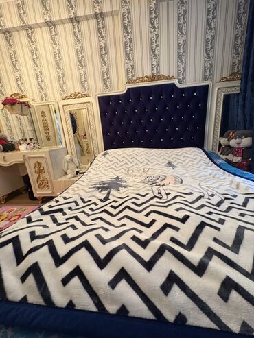 - Çarpayı: tünd göy məxmər başlıq, kapitone düyməli dizayn, çərçivədə krem rəng və qızılı bəzəklər.