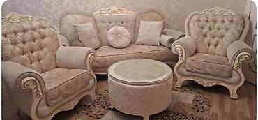 Mebel dəsti otağa eleqant və zəngin görünüş qatır, yumşaq oturuş və arxaya rahat dəstək təmin edir. Oyma detallar və kapitone işləmə vizual olaraq dəbdəbə effektini artırır.
