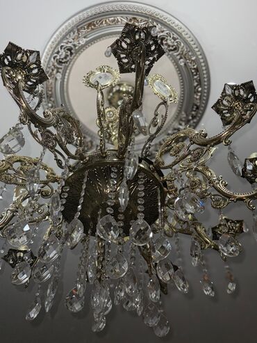 Klassik üslubda tavan çilçırağı - Material: metal korpus (qızılı/bronz tonlarda) və çoxsaylı kəsimli kristal asqılar - Dizayn: çoxqollu konstruksiya, hər qolda şam formalı E14 patronlu lampalar; m...