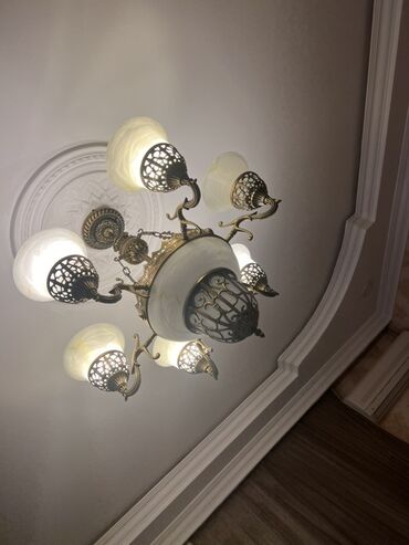 - Material: tökmə metal gövdə (antik bürünc tonlarında) və mərmərə bənzər şüşə/plafon kasa