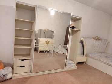 - Şkaf: sürgülü qapılı, böyük güzgü ilə. Sol tərəfdə çoxsaylı rəflər və 2 çekmece, sağ tərəfdə asqılı bölmə və yuxarı rəf. Güzgü üzərində naxışlı şüşə ornament.