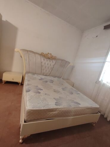 - Yataq çərçivəsi: yumşaq başlıqlı, krem rəngdə parça üzlü, üst hissədə qızılı dekor elementləri. Yanlarda oyma qızılı ayaqlar.