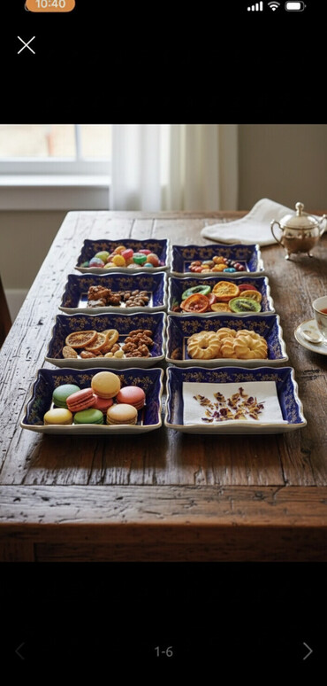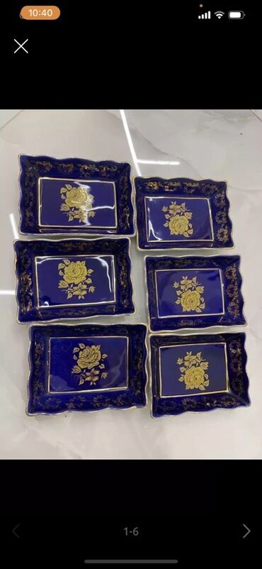 Məhsul: Kobalt mavi rəngdə, qızılı naxışlı 6 ədəd düzbucaqlı porselen boşqab dəsti.