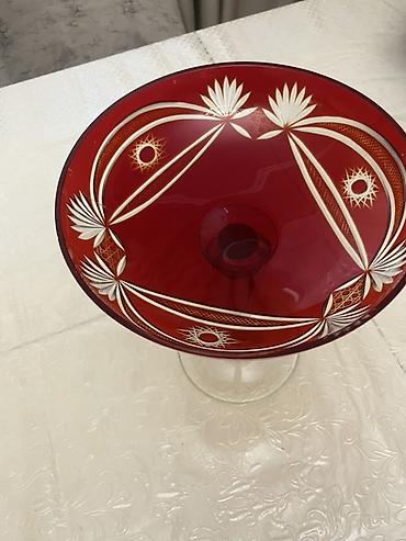 - Qırmızı dekorativ meyvə/gül qabı: Kase hissəsi qırmızı rəngdədir, kənarlarında əl işi oyma-gümüşü naxışlar və ulduz motivləri var. Hündür, çoxbucaqlı kəsimli şəffaf şüşə ayaq üstündədir. Masa ortası və ya desert təqdimatı üçün uyğundur.