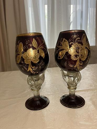 - Qızılı naxışlı iki qədəh: Tünd-bordo tonlu kase hissəsi, ətrafında iri qızılı çiçək ornamentləri. Şəffaf, fiqurlu aralıq hissəli dekorativ ayaq və tünd-bordo dib. Servis və vitrin üçün kolleksiya xarakterli cütlük.