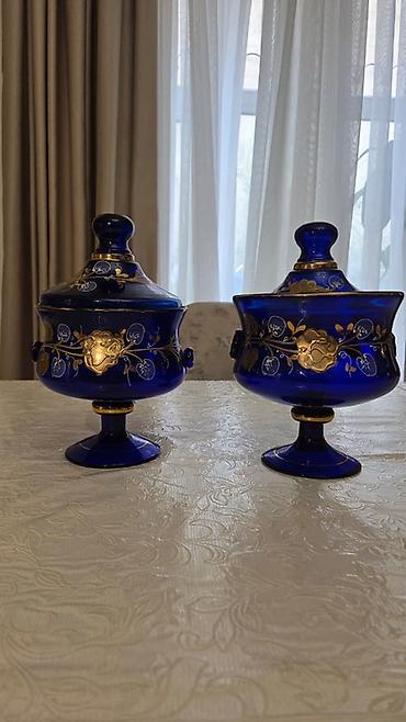 - Kobalt-mavi qapaqlı iki şirniyyat qabı: Hər ikisi pedestallı formadadır. Dərin kobalt şüşə üzərində qızılı və ağ boya ilə əl naxışları, üzük şəklində dekorativ tutacaqlar və uyğun qapaqlar. Şirniyyat, konfet və ya dekor üçün ideal.