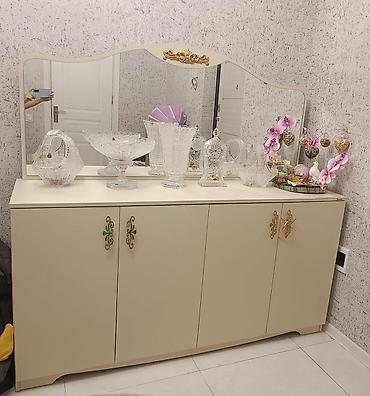 Ağır, sanballı mebellərdir. Qorka və barnik əla vəziyyətdədir. Güzgülünün isə sürməsində balaca qopma var, bərpa oluna bilər. Ona görə münasib qiymətə qoyulub. ev balaca olduğu üçün satılır.