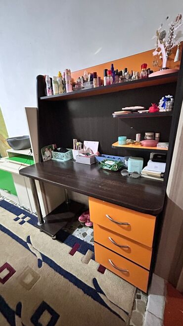 - Material: laminat MDF, tünd qəhvəyi stolüstü, parlaq narıncı önlüklər