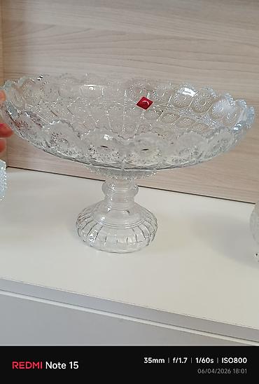 Şüşə qab – ayaqlı meyvə/gülab qabı - Material: qalın, şəffaf şüşə - Dizayn: kəsimli naxışlı, dalğalı kənar, klassik ornamentlər - Forma: ayaqlı, hündür stendli kasa - Ölçü təxmini: diametr ~20–23 ...