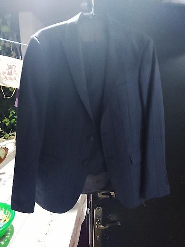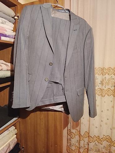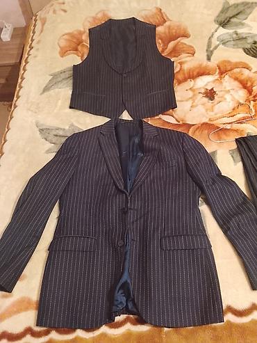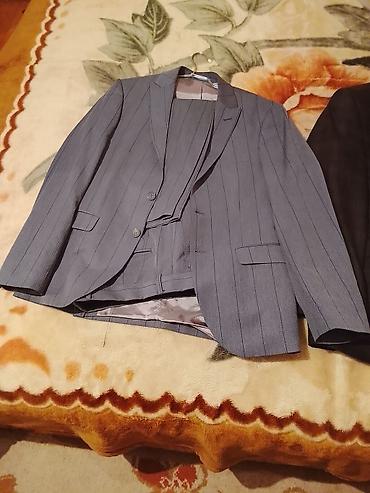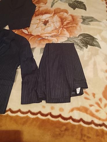 - Mavi zolaqlı kostyum: 2 düyməli, çalarlı mavi parça, incə şaquli zolaqlar. Yanaq cibləri qapaqlı, sinə cibı, arxa hissədə yarıq. İçlikli. Şalvar eyni parça və naxışdadır.