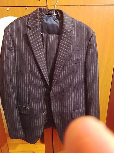 - Tünd göy pinstripe kostyum: incə ağ zolaqlı parça, 2 düyməli pencək, qapaqlı yan ciblər və sinə cibı. Dəstinə uyğun tünd göy zolaqlı şalvar daxildir.