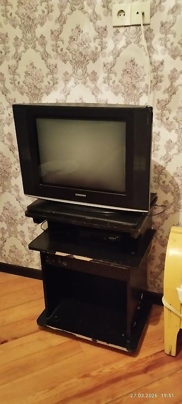 - Televizor: Samsung markalı köhnə model (kineskop). Səsgücləndiricilər yan hissələrdə, ön paneldə idarə düymələri. TV altlığı ilə birlikdə verilir; altlıqda üst fırlanan platforma və əlavə rəf bölmələri mövcuddur – TV tuner və ya aksesuarlar üçün uyğundur.