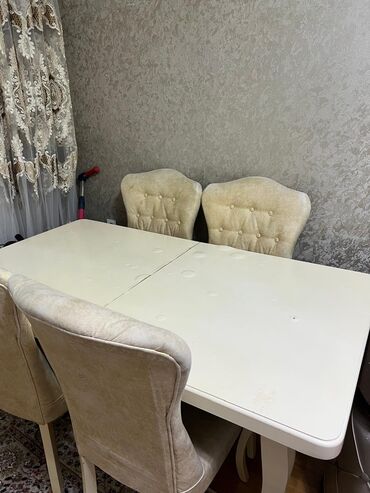Açılıb-bağlanan yemək masası və 4 ədəd yumşaq oturacaqlı stol dəsti. - Masa: krem/ağ rəng, oval bucaqlı düzbucaqlı forma, üstü iki hissəli açılan mexanizmli. Üst tabla qalın, kənarları yumru profi...