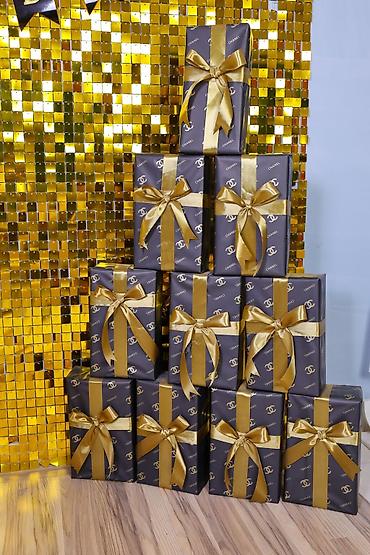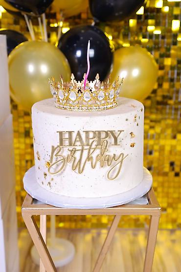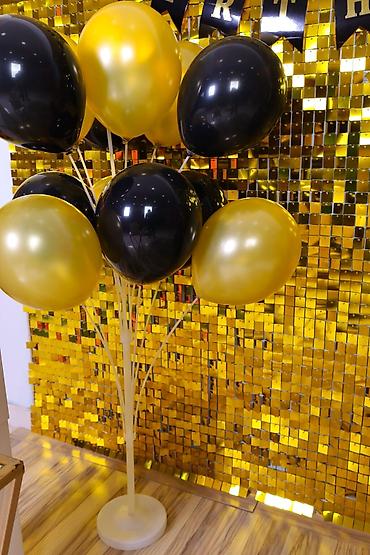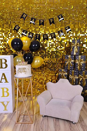 Dekorativ mühitdə (qızılı-qara şarlar, “Happy Birthday” pankartı və tortla) nümayiş olunub; əsas məhsul – uşaq kreslosudur.