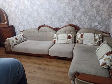 Künc divan və iri kreslo dəsti - Rəng: karamellə bej kombinasiyası - Material: yumşaq parça üzlük, relyefli tikişlər; dekorativ tünd ağac elementləri - Komplekt: L formalı künc divan + uyğun iri k...