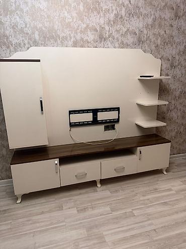 - TV stendi: Açıq krem rəngli korpus, tünd ağac effektli üst panel. Asma arxa paneli ilə birlikdə TV üçün divar bələdçisi/daşıyıcı kronşteyn quraşdırılıb. Sol tərəfdə şkaf qapısı, aşağı hissədə 3 çekmece və 2 qapalı bölmə, sağ tərəfdə 3 ədəd açıq künc rəfi. Zərif qıvrımlı üst kontur və balaca dekorativ ayaqlar.