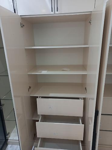 Ağ rəngli künc qarderob, müasir dizaynlı geniş saxlama həlləri təklif edir. Bu qarderob geyimləri, ayaqqabıları və aksesuarları səliqəli şəkildə saxlamaq üçün çoxlu rəflər, asma şöbələr və çekmecələrlə təchiz olunmuşdur. Şəffaf şüşə qapılı bir şkaf bölməsi, daxili əşyaları nümayiş etdirmək üçün əlavə funksionallıq verir. Qarderobun yuxarı hissəsində əlavə saxlama üçün əlavə dolablar mövcuddur.