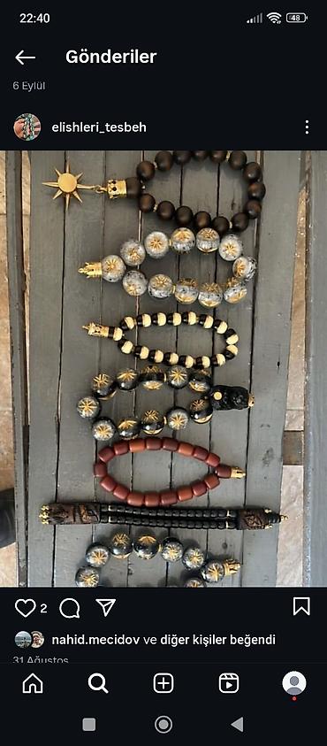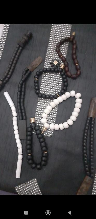 - Şəkillərdə göstərilən müxtəlif modellər mövcuddur: qara ağac tespih günəş asqılı, tünd qəhvəyi ağac muncuqlu versiyalar, ağ və qara elastik qolbaqlar, həmçinin qarışıq bəzəkli variantlar.