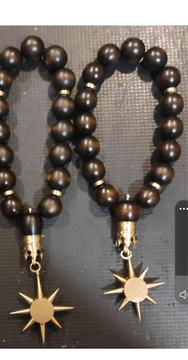 - Materiallar: ağac muncuqlar (qara, tünd qəhvəyi, ağ), dekorativ metal ara hissələr və uclar; bəzi modellərdə qızılı rəngli günəş formalı asqı.