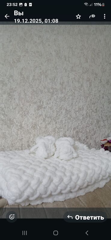 Əl işı: yumşaq toxumalı plaşet/örtük - Material: qalın, peluş effektli ip (xəz kimi yumşaq), toxunma texnikası ilə iri ilməli naxış - Rəng: krem/bez - Ölçü: divan üzərində şəkillərdə gördüyünüz ki...