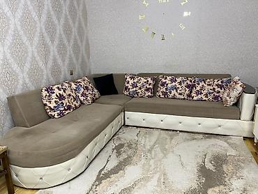 Künc divan dəsti "Damla" firma. Yeni kimi - Forma: L-şəkilli, geniş oturma sahəsi ilə - Rəng: Açıq boz əsas, çiçək naxışlı krem-qəhvəyi arkalıq yastıqları - Material: Yumşaq parça üzlük, dekor...