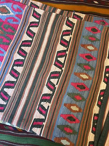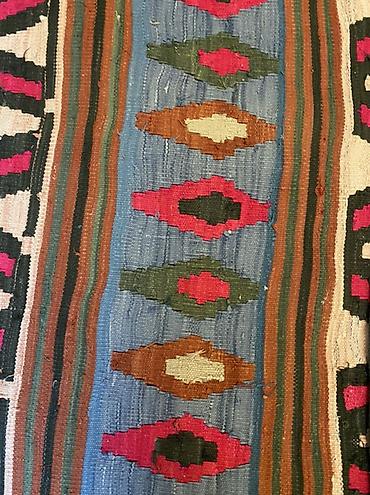 Əl toxuması kilim - Material: təbii ipliklərdən toxunmuş kilim - Dizayn: ənənəvi zolaqlı kompozisiya, qafqaz motivləri və “göz” (göy, sarı, qırmızı) romb naxışları, pilləli (sərhəd) ornamentlər - ...
