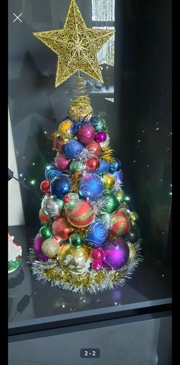 Tərkib: plastik/şüşə top bəzəkləri, metalik tinsel, LED işıq zənciri, qızılı ulduz toppər.
