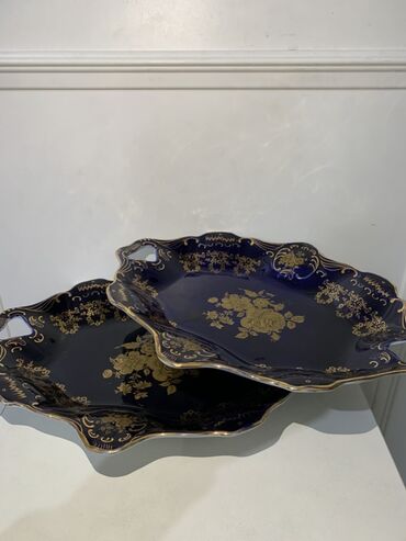 - Kobalt mavi porselendan 2 ədəd bəzəkli sini/daşınma boşqabı. Dalğalı kənar, qızılı güllü ornament və inteqrə tutacaqlar.